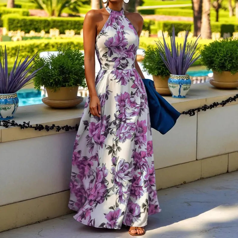Sleeveless Maxi Dress | Floral Halter Neck | Elegant A-Line Long Dress for Wedding Guest & Cocktail Events