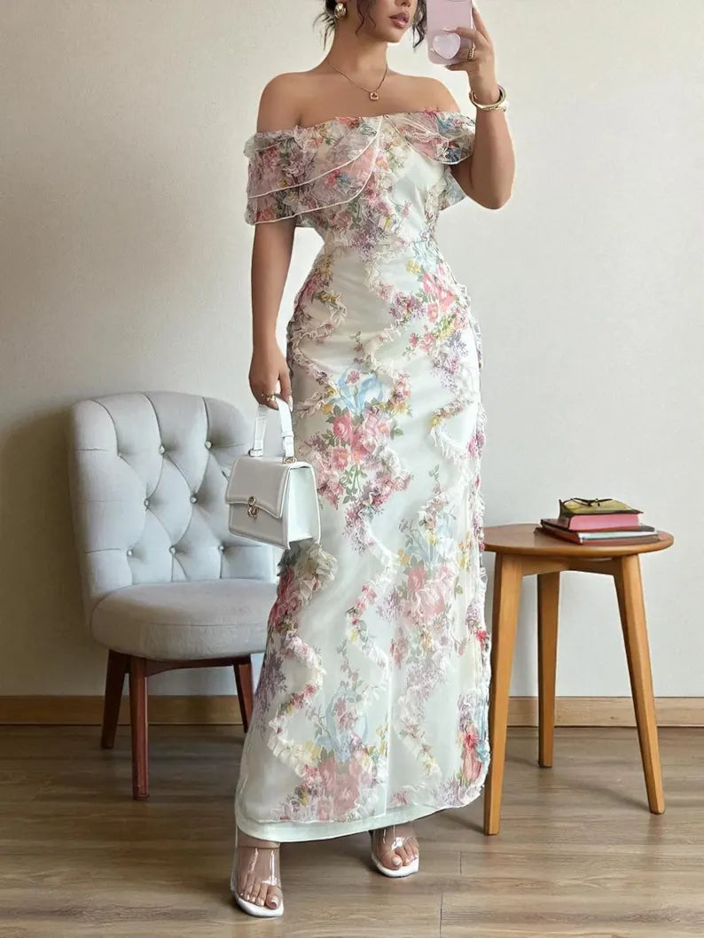 Step into timeless elegance with this floral off-shoulder maxi dress, designed to make you stand out at any occasion.
